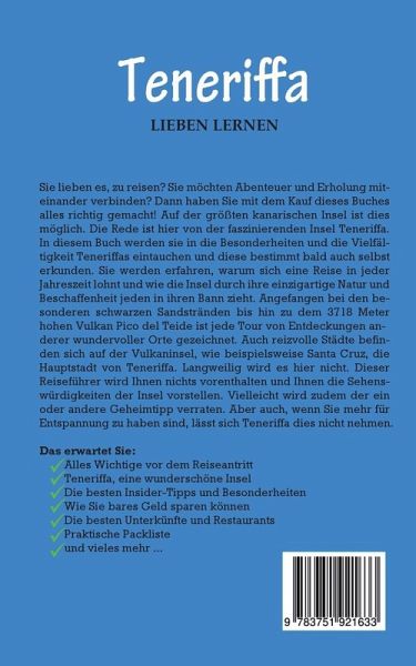 Sie lieben es, zu reisen? Sie möchten Abenteuer und Erholung miteinander verbinden? Dann haben Sie mit dem Kauf dieses Buches alles richtig gemacht! Auf der größten kanarischen Insel ist dies möglich. Die Rede ist hier von der faszinierenden Insel Teneriffa. In diesem Buch werden sie in die Besonderheiten und die Vielfältigkeit Teneriffas eintauchen und diese bestimmt bald auch selbst erkunden. Sie werden erfahren, warum sich eine Reise in jeder Jahreszeit lohnt und wie die Insel durch ihre einzigartige Natur und Beschaffenheit jeden in ihren Bann zieht. Angefangen bei den besonderen schwarzen Sandstränden bis hin zu dem 3718 Meter hohen Vulkan Pico del Teide ist jede Tour von Entdeckungen an-derer wundervoller Orte gezeichnet. Auch reizvolle Städte befinden sich auf der Vulkaninsel, wie beispielsweise Santa Cruz, die Hauptstadt von Teneriffa. Langweilig wird es hier nicht. Dieser Reiseführer wird Ihnen nichts vorenthalten und Ihnen die Sehenswürdigkeiten der Insel vorstellen. Vielleicht wird zudem der ein oder andere Geheimtipp verraten. Aber auch, wenn Sie mehr für Entspannung zu haben sind, lässt sich Teneriffa dies nicht nehmen. Das erwartet Sie:-Alles Wichtige vor dem Reiseantritt-Teneriffa, eine wunderschöne Insel-Die besten Insider-Tipps und Besonderheiten-Wie Sie bares Geld sparen können-Die besten Unterkünfte und Restaurants-Praktische Packliste-und vieles mehr ...