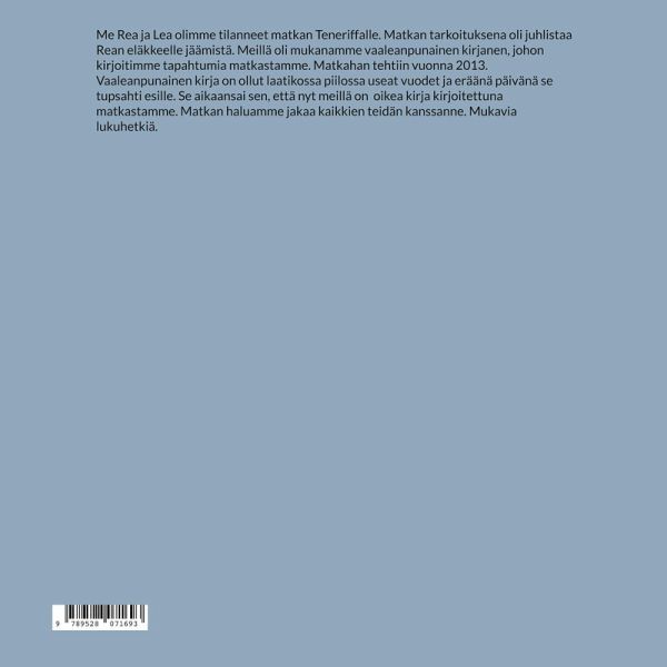 Me Rea ja Lea olimme tilanneet matkan Teneriffalle. Matkan tarkoituksena oli juhlistaa Rean eläkkeelle jäämistä. Meillä oli mukanamme vaaleanpunainen kirjanen, johon kirjoitimme tapahtumia matkastamme. Matkahan tehtiin vuonna 2013. Vaaleanpunainen kirja on ollut laatikossa piilossa useat vuodet ja eräänä päivänä se tupsahti esille. Se aikaansai sen, että nyt meillä on oikea kirja kirjoitettuna matkastamme. Matkan haluamme jakaa kaikkien teidän kanssanne. Mukavia lukuhetkiä.