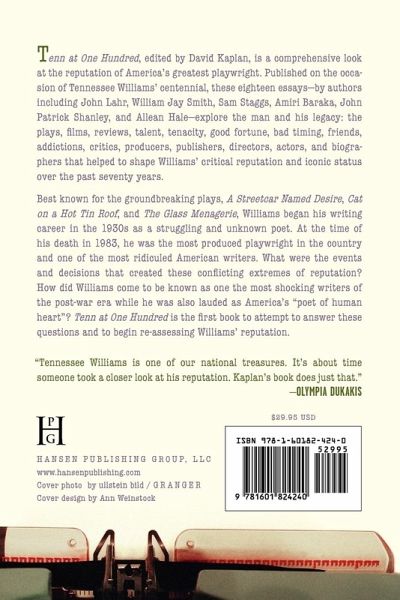 Edited by David Kaplan, Tenn at One Hundred is the first comprehensive look at the reputation of Tennessee Williams, America's greatest playwright. Being published in 2011 on the occasion of Tennessee Williams centennial year, Tenn at One Hundred takes a behind the scenes look at how reputations are made. It's a collection of the leading Williams advocates who had something to say, and wanted to say it this year, and in this forum. The book is a must for anyone curious about how American icons are built up, then publicly attacked, and then, rarely given the time, begin to assert their own worth as has happened with Tennessee Williams. Best known for the groundbreaking plays, A Streetcar Named Desire, Cat on a Hot Tin Roof, and The Glass Menagerie, Tennessee Williams began his writing career in the 1930s as a struggling and unknown poet. At the time of his death in 1983, he was the most produced playwright in the country and at the same time one of the most despised and ridiculed American writers. What were the events and decisions that brought Tennessee Williams to these contradictory extremes of reputation? How did Tennessee Williams come to be known as one the most scandalous writers of the post-war era while he was also lauded as America s poet of human heart? Tenn at One Hundred explores the man and his legacy: the plays, films, reviews, talent, tenacity, good fortune, bad timing, friends, addictions, critics, producers, publishers, directors, actors, and biographers that helped to shape Tennessee Williams' critical reputation and iconic status in the popular imagination over the past seventy years.