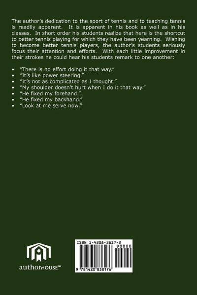 The author's dedication to the sport of tennis and to teaching tennis is readily apparent. It is apparent in his book as well as in his classes. In short order his students realize that here is the shortcut to better tennis playing for which they have been yearning. Wishing to become better tennis players, the author's students seriously focus their attention and efforts. With each little improvement in their strokes he could hear his students remark to one another: · "There is no effort doing it that way." · "It's like power steering." · "It's not as complicated as I thought." · "My shoulder doesn't hurt when I do it that way." · "He fixed my forehand." · "He fixed my backhand." · "Look at me serve now."