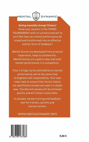 Acting mentally strong! Victory! Show your passion in the TENNIS TOURNAMENT with an unrestrained will to win! But how can mental performance be scaled and transformed into an effective and fair form of feedback? Mental Scores are developed from practical experience, helps to achieve this.Mental Scores are used to view and scale mental performance in a competition. Thus it brings clarity and stability to mental performance and at the same time strengthens self-responsibility. Your own notes help to ensure that mental talents are specifically trained and used in a stable way. The desired success will be achieved quickly and will remain sustainable. A valuable mental training and feedback tool for trainers, parents and mental trainers.WWW.MENTALDYNAMIC.INFO