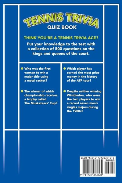 Know your lobs from your drop shots? Your Nadals from your Navratilovas? Put your tennis knowledge to the test with this bumper collection of quizzes on the kings and queens of the court. The Tennis Trivia Quiz Book covers all aspects of the game including Wimbledon, the Australian Open, the French Open, the U.S. Open, the Davis Cup, the Billie Jean King Cup and much else besides. The biggest names in the history of the game are present and correct so look out for questions on Roger Federer, Serena Williams, Novak Djokovic, Steffi Graf, Andy Murray, Carlos Alcaraz and many, many more. There are 500 questions in total covering the big tournaments and the top players from both the men's and women's game. Each quiz contains a selection of 20 questions and is either a mixed bag of pot luck testers or is centred on a specific category such as the Firsts and Lasts or All-Time Greats. There are easy, medium and hard questions offering something for tennis novices as well as professors of the game. The winner of which championship receives a trophy called The Musketeers' Cup? Who was the first woman to win a Major title using a metal racket? Which player has earned the most prize money in the history of the ATP Tour? Despite neither winning Wimbledon, who were the two players to win a record seven Men's Singles Majors during the 1980s? Find out the answers to these and many more questions in the Tennis Trivia Quiz Book.