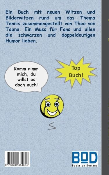 Ein Buch mit neuen Witzen und Bilderwitzen rund um das Thema TENNIS zusammengestellt von Theo von Taane. Ein Muss für Fans und alle, die schwarzen und doppeldeutigen Humor lieben. Lustige Witze mit Matchball Effekt!