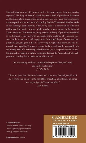 This 1992 study of Tennyson evolves its themes from the weaving figure of The Lady of Shalott, which becomes a kind of parable for the author and his texts. Taking its derivation from the Latin texere, 'to weave', Professor Joseph's focus on poetic texture and a sense of textuality leads to a consciousness of his own critical and interpretative weaving, while revealing a pattern in the fabric of Tennyson's work. This procedure brings together a theory of perception, developed in the first part of this study, with an analysis of the gendering of Tennyson's characters in the second part, and engages with the methodologies of deconstruction, psychoanalysis, and gender theory. The weaving metaphor also opens up a key theoretical issue regarding Tennyson's poetics: is the textual shuttle managed by the controlling hand of a historically definable author, or is the poetic weaver 'cursed' like the Lady of Shalott to suffer a mystifying doom at the 'unseen hand' of an all-pervasive textuality that occludes authorial intention?