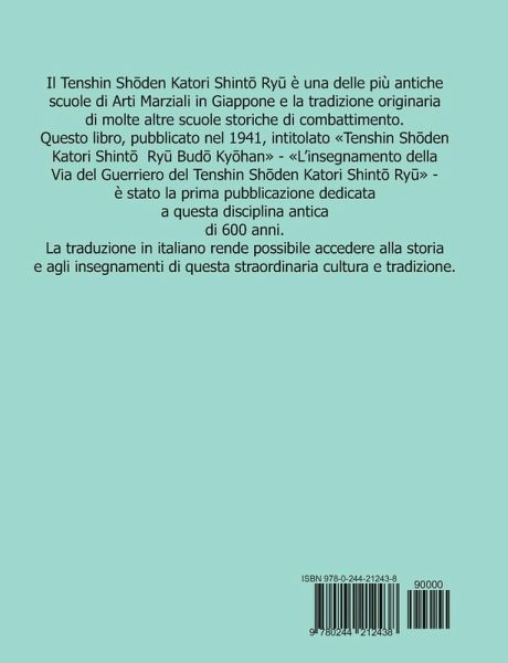 Il Tenshin Sh¿den Katori Shint¿ Ry¿ è una delle più antiche scuole di Arti Marziali in Giappone e la tradizione originaria di molte altre scuole storiche di combattimento. Questo libro, pubblicato nel 1941, intitolato "Tenshin Sh¿den Katori Shint¿ Ry¿ Bud¿ Ky¿han" - "L'Insegnamento della Via del Guerriero del Tenshin Sh¿den Katori Shint¿ Ry¿" - è stato la prima pubblicazione che tratta questa disciplina antica di 600 anni. La traduzione in italiano rende possibile accedere alla storia e agli insegnamenti di questa straordinaria cultura e tradizione.