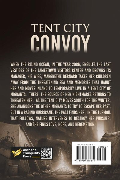 When the rising ocean, in the year 2086, engulfs the last vestiges of the Jamestown Visitors Center and drowns its manager, his wife, Margrethe Bernard takes her children away from the threatening sea and memories that haunt her and moves inland to temporarily live in a tent city of migrants. There, the source of her nightmares returns to threaten her. As the tent city moves south for the winter, she abandons the other migrants to try to escape her past, but in a raging hurricane, the past finds her. In the turmoil that follows, nature intervenes to destroy her pursuer, and she finds love, hope, and redemption.