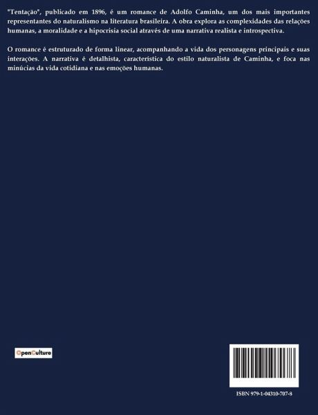 "Tentação", publicado em 1896, é um romance de Adolfo Caminha, um dos mais importantes representantes do naturalismo na literatura brasileira. A obra explora as complexidades das relações humanas, a moralidade e a hipocrisia social através de uma narrativa realista e introspectiva. O romance é estruturado de forma linear, acompanhando a vida dos personagens principais e suas interações. A narrativa é detalhista, característica do estilo naturalista de Caminha, e foca nas minúcias da vida cotidiana e nas emoções humanas.