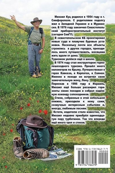 Poems in this small book are not the result of persistent work at the table. This is a reaction to some events. The verse comes all at once or almost like that. For example, the verse "Stones" was written in thirty minutes. There are no parodies here. Just sometimes well-known poetry influences the rhythm of a new poem. The book and the first verse are called "The Tenth Pair." For every worn pair of hiking boots is a kind of milestone in my life, and it is not about miles behind me. Regards, Michael Michael Kuts was born in 1954 in Simferopol. He lived with his parents in Western Ukraine and in Murmansk. In 1976 Michael graduated from the Sevastopol Instrument-Making University. In the Sevastopol design bureau, he designed new ships and floating drilling rigs. Since most the projects were built in other cities, Michael traveled a lot and lived away from home for months. He became interested in tourism back in high school. In 1974 Michael became a licensed instructor of mountain hiking. Walked many kilometers across Crimea peninsula. Traveled in the Caucasus mountains, in the Carpathians, in the Sayan Mountains. It was on the trail, when he met his wonderful wife, Lena. Having moved to Israel in 1996, Mikhail further expanded the horizons of his travels and get together a good team of his friends and fellow hikers. The poems collected in this small book came to him on their own, as a reflection of interesting events and, sometimes, in rhymes with his favorite songs.