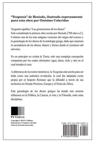 "Teogonía" de Hesíodo, ilustrado expresamente para esta obra por Onésimo Colavidas Teogonía significa "Las generaciones de los dioses" Está considerada la primera obra escrita por Hesíodo [700 años a.C]. Contiene una de las más antiguas versiones del origen del cosmos y la genealogía de los dioses de la mitología griega, dado que enumera la ascendencia de los dioses, titanes y héroes desde el comienzo del universo. En un principio no existía la Tierra, solo una compleja concepción compuesta por los cuatro elementos: agua, tierra, cielo y aire en el cual reinaba el caos. A diferencia de los textos homéricos, la Teogonía está escrita para ser leída como una auténtica revelación, la cual fue adoptada como propia por el Imperio Romano que la difundió a través de sus territorios en Oriente Próximo, Europa y el Norte de África. Esta genealogía de los dioses griegos ha tenido una enorme influencia en la Política, la Ciencia, el Arte y la Filosofía, entre otras disciplinas.