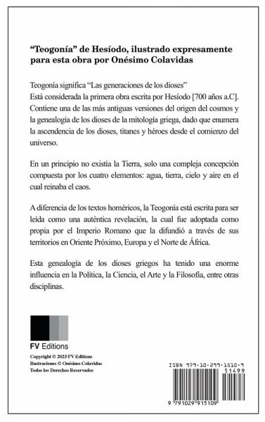 "Teogonía" de Hesíodo, ilustrado expresamente para esta obra por Onésimo Colavidas Teogonía significa "Las generaciones de los dioses" Está considerada la primera obra escrita por Hesíodo [700 años a.C]. Contiene una de las más antiguas versiones del origen del cosmos y la genealogía de los dioses de la mitología griega, dado que enumera la ascendencia de los dioses, titanes y héroes desde el comienzo del universo. En un principio no existía la Tierra, solo una compleja concepción compuesta por los cuatro elementos: agua, tierra, cielo y aire en el cual reinaba el caos. A diferencia de los textos homéricos, la Teogonía está escrita para ser leída como una auténtica revelación, la cual fue adoptada como propia por el Imperio Romano que la difundió a través de sus territorios en Oriente Próximo, Europa y el Norte de África. Esta genealogía de los dioses griegos ha tenido una enorme influencia en la Política, la Ciencia, el Arte y la Filosofía, entre otras disciplinas.