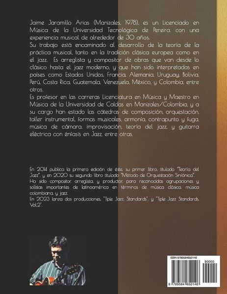 Jaime Jaramillo Arias (Manizales, 1978), es un Licenciado en Música de la Universidad Tecnológica de Pereira, con una experiencia musical de alrededor de 30 años. Su trabajo está encaminado al desarrollo de la teoría de la práctica musical, tanto en la tradición clásica europea como en el jazz. Es arreglista y compositor de obras que van desde lo clásico hasta el jazz moderno, y que han sido interpretadas en países como Estados Unidos, Francia, Alemania, Uruguay, Bolivia, Perú, Costa Rica, Guatemala, Venezuela, México, y Colombia, entre otros. Es profesor en las carreras Licenciatura en Música y Maestro en Música de la Universidad de Caldas en Manizales/Colombia, y a su cargo han estado las cátedras de composición, orquestación, taller instrumental, formas musicales, armonía, contrapunto y fuga, música de cámara, improvisación, teoría del jazz, y guitarra eléctrica con énfasis en Jazz, entre otras. En 2014 publica éste, su primer libro titulado "Teoría del Jazz", y en 2020 su segundo libro titulado "Método de Orquestación Sinfónica". Ha sido compositor, arreglista, y productor, para reconocidas agrupaciones y solistas importantes del país en términos de música clásica, música latinoamericana, y jazz.