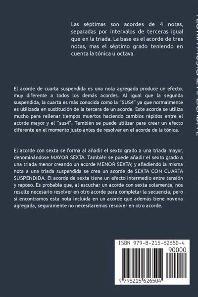 Las séptimas son acordes de 4 notas, separadas por intervalos de terceras igual que en la triada. La base es el acorde de tres notas, mas el séptimo grado teniendo en cuenta la tónica u octava; Las séptimas pueden ser mayores, menores, disminuidas; por cuestión de sonoridad hay triadas menores con séptima menor, triadas mayores o aumentadas con séptima mayor o menor y triadas disminuidas con séptima menor o disminuida. La cuarta suspendida es una nota agregada que produce un efecto, muy diferente a todos los demás acordes. Al igual que la segunda suspendida, la cuarta es más conocida como la "SUS4" ya que normalmente es utilizada en sustitución de la tercera de un acorde. El acorde de cuarta suspendida, puede utilizar estas tres notas o puede ir acompañada de una séptima menor, que para la sonoridad del acorde es la más aconsejada. El acorde de sexta se forma al añadir el sexto grado a una triada mayor, denominándose MAYOR SEXTA. También se puede añadir el sexto grado a una triada menor creando un acorde MENOR SEXTA; y añadiendo la misma nota a una triada suspendida se crea un acorde de SEXTA CON CUARTA SUSPENDIDA.