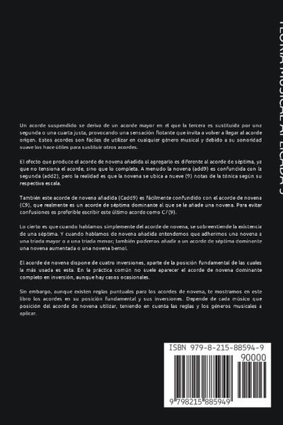 Un acorde suspendido se deriva de un acorde mayor en el que la tercera es sustituida por una segunda o una cuarta justa, provocando una sensación flotante que invita a volver a llegar al acorde origen. Estos acordes son fáciles de utilizar en cualquier género musical y debido a su sonoridad suave los hace útiles para sustituir otros acordes. El efecto que produce el acorde de novena añadida al agregarlo es diferente al acorde de séptima, ya que no tensiona el acorde, sino que lo completa. A menudo la novena (add9) es confundida con la segunda (add2), pero la realidad es que la novena se ubica a nueve (9) notas de la tónica según su respectiva escala. También este acorde de novena añadida (Cadd9) es fácilmente confundido con el acorde de novena (C9), que realmente es un acorde de séptima dominante al que se le añade una novena. Para evitar confusiones es preferible escribir este último acorde como C7(9). Lo cierto es que cuando hablamos simplemente del acorde de novena, se sobreentiende la existencia de una séptima. Y cuando hablamos de novena añadida entendemos que adherimos una novena a una triada mayor o a una triada menor; también podemos añadir a un acorde de séptima dominante una novena aumentada o una novena bemol. El acorde de novena dispone de cuatro inversiones, aparte de la posición fundamental de las cuales la más usada es esta. En la práctica común no suele aparecer el acorde de novena dominante completo en inversión, aunque hay casos ocasionales. Sin embargo, aunque existen reglas puntuales para los acordes de novena, te mostramos en este libro los acordes en su posición fundamental y sus inversiones. Depende de cada músico que posición del acorde de novena utilizar, teniendo en cuenta las reglas y los géneros musicales a aplicar.