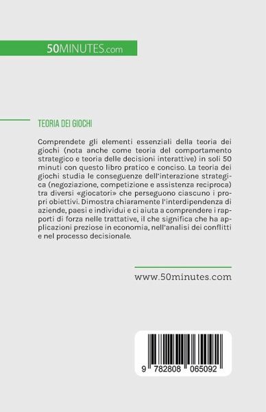 Comprendete gli elementi essenziali della teoria dei giochi (nota anche come teoria del comportamento strategico e teoria delle decisioni interattive) in soli 50 minuti con questo libro pratico e conciso. La teoria dei giochi studia le conseguenze dell'interazione strategica (negoziazione, competizione e assistenza reciproca) tra diversi "giocatori" che perseguono ciascuno i propri obiettivi. Dimostra chiaramente l'interdipendenza di aziende, paesi e individui e ci aiuta a comprendere i rapporti di forza nelle trattative, il che significa che ha applicazioni preziose in economia, nell'analisi dei conflitti e nel processo decisionale. Questo libro vi fornirà una pratica introduzione alla complessità delle interazioni sociali e alle applicazioni pratiche della teoria dei giochi in diversi ambiti. Oltre a imparare a mettere in atto strategie nelle vostre interazioni con gli altri, prenderete in considerazione una serie di esempi, come il classico problema del dilemma del prigioniero, scoprirete le carenze dello strumento, compresa la relativa difficoltà di applicarlo a situazioni reali, e imparerete a conoscere modelli correlati, come i giochi di insiemi e i giochi infiniti. La teoria dei giochi: Le origini della teoria dei giochi possono essere fatte risalire al Rinascimento, quando apparvero le prime analisi dei giochi di strategia, anche se fino al XIX e XX secolo non esisteva una teoria formale. La teoria studia l'interazione sociale e si propone di dimostrare che gli individui, le aziende e i Paesi sono reciprocamente interdipendenti. Di conseguenza, il passo più vantaggioso per tutte le parti coinvolte è trovare un equilibrio che soddisfi tutte le parti. Anche se la cooperazione non è la cosa più facile del mondo, il modo migliore per affrontare la necessità di lavorare insieme è capirla, non combatterla. In questo libro scoprirete come la teoria dei giochi può aiutarvi, imparerete ad applicarla a diversi campi e userete i risultati per elaborare una strategia appropriata. Una chiara spiegazione dei vantaggi e dei potenziali svantaggi del metodo, la discussione di un caso pratico e un'introduzione ai modelli correlati vi forniranno gli strumenti necessari per adattare l'approccio alla vostra situazione.