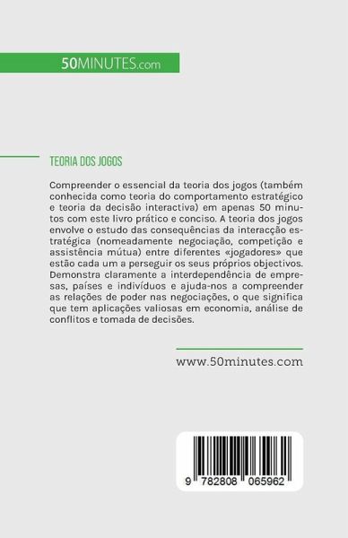 Compreender o essencial da teoria dos jogos (também conhecida como teoria do comportamento estratégico e teoria da decisão interactiva) em apenas 50 minutos com este livro prático e conciso. A teoria dos jogos envolve o estudo das consequências da interacção estratégica (nomeadamente negociação, competição e assistência mútua) entre diferentes "jogadores" que estão cada um a perseguir os seus próprios objectivos. Demonstra claramente a interdependência de empresas, países e indivíduos e ajuda-nos a compreender as relações de poder nas negociações, o que significa que tem aplicações valiosas em economia, análise de conflitos e tomada de decisões. Este livro fornecerá uma introdução útil à complexidade das interacções sociais e às aplicações práticas da teoria dos jogos numa série de domínios. Para além de aprender a implementar estratégias nas suas interacções com outros, irá considerar uma série de exemplos, tais como o problema clássico do dilema do prisioneiro, descobrir as deficiências da ferramenta, incluindo a dificuldade relativa de a aplicar a situações da vida real, e aprender sobre modelos relacionados, tais como jogos de set e jogos infinitos. Sobre a teoria dos jogos : As origens da teoria dos jogos podem ser rastreadas até à Renascença, quando surgiram as primeiras análises de jogos de estratégia, embora nenhuma teoria formal tenha existido até aos séculos XIX e XX. A teoria estuda a interacção social e procura provar que indivíduos, empresas e países são mutuamente interdependentes. Como resultado, o passo mais benéfico para todos os envolvidos é encontrar um equilíbrio que sirva a todas as partes. Embora a cooperação possa não ser a coisa mais fácil do mundo, a melhor maneira de lidar com a necessidade de trabalhar em conjunto é compreendê-la, não combatê-la. Neste livro, descobrirá como a teoria do jogo o pode ajudar, aprenderá como aplicá-la em diferentes campos, e utilizará os seus resultados para elaborar uma estratégia apropriada. Uma explicação clara dos benefícios e potenciais inconvenientes do método, uma discussão de um estudo de caso prático, e uma introdução a modelos relacionados dar-lhe-ão as ferramentas de que necessita para adaptar a sua abordagem à sua situação.