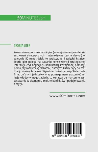 Zrozumienie podstaw teorii gier (znanej równie¿ jako teoria zachowä strategicznych i interaktywna teoria decyzji) w zaledwie 50 minut dzi¿ki tej praktycznej i zwi¿z¿ej ksi¿¿ce. Teoria gier polega na badaniu konsekwencji strategicznej interakcji (czyli negocjacji, konkurencji i wzajemnej pomocy) pomi¿dzy ró¿nymi "graczami", z których kädy d¿¿y do realizacji w¿asnych celów. Wyränie pokazuje wspó¿zale¿nö¿ firm, pästw i jednostek oraz pomaga nam zrozumie¿ relacje w¿adzy w negocjacjach, co oznacza, ¿e ma cenne zastosowania w ekonomii, analizie konfliktów i podejmowaniu decyzji. Ta ksi¿¿ka zapewni Ci por¿czne wprowadzenie do z¿öonöci interakcji spöecznych i praktycznych zastosowä teorii gier w wielu dziedzinach. Oprócz nauki wdräania strategii w interakcjach z innymi, rozwäysz wiele przyk¿adów, takich jak klasyczny problem dylematu wi¿¿nia, dowiesz si¿ o niedoskonäöciach narz¿dzia, w tym o wzgl¿dnej trudnöci zastosowania go w rzeczywistych sytuacjach, oraz poznasz pokrewne modele, takie jak gry ustalone i gry niesköczone. O teorii gier : Pocz¿tki teorii gier si¿gaj¿ renesansu, kiedy to pojawi¿y si¿ pierwsze analizy gier strategicznych, chö ¿adna formalna teoria nie istniäa ä do XIX i XX wieku. Teoria ta bada interakcje spöeczne i stawia sobie za cel udowodnienie, ¿e jednostki, firmy i pästwa s¿ wzajemnie zale¿ne. W rezultacie najkorzystniejszym krokiem dla wszystkich zaangäowanych jest znalezienie równowagi, która odpowiada wszystkim stronom. Chö wspó¿praca möe nie by¿ naj¿atwiejsz¿ rzecz¿ na ¿wiecie, najlepszym sposobem radzenia sobie z koniecznöci¿ wspó¿dziäania jest jej zrozumienie, a nie zwalczanie. W tej ksi¿¿ce odkryjesz, jak teoria gier möe ci pomóc, nauczysz si¿ stosowä j¿ w ró¿nych dziedzinach i wykorzystasz wyniki do opracowania odpowiedniej strategii. Jasne wyjänienie korzy¿ci i potencjalnych wad metody, omówienie praktycznego studium przypadku oraz wprowadzenie do pokrewnych modeli da ci narz¿dzia potrzebne do dostosowania podej¿cia do twojej sytuacji.