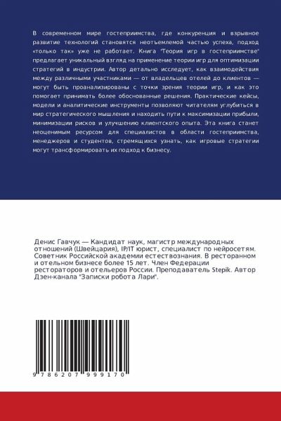 V sowremennom mire gostepriimstwa, gde konkurenciq i wzrywnoe razwitie tehnologij stanowqtsq neot#emlemoj chast'ü uspeha, podhod 'tol'ko tak' uzhe ne rabotaet. Kniga "Teoriq igr w gostepriimstwe" predlagaet unikal'nyj wzglqd na primenenie teorii igr dlq optimizacii strategij w industrii. Awtor detal'no issleduet, kak wzaimodejstwiq mezhdu razlichnymi uchastnikami - ot wladel'cew otelej do klientow - mogut byt' proanalizirowany s tochki zreniq teorii igr, i kak äto pomogaet prinimat' bolee obosnowannye resheniq. Prakticheskie kejsy, modeli i analiticheskie instrumenty pozwolqüt chitatelqm uglubit'sq w mir strategicheskogo myshleniq i nahodit' puti k maximizacii pribyli, minimizacii riskow i uluchsheniü klientskogo opyta. Jeta kniga stanet neocenimym resursom dlq specialistow w oblasti gostepriimstwa, menedzherow i studentow, stremqschihsq uznat', kak igrowye strategii mogut transformirowat' ih podhod k biznesu.