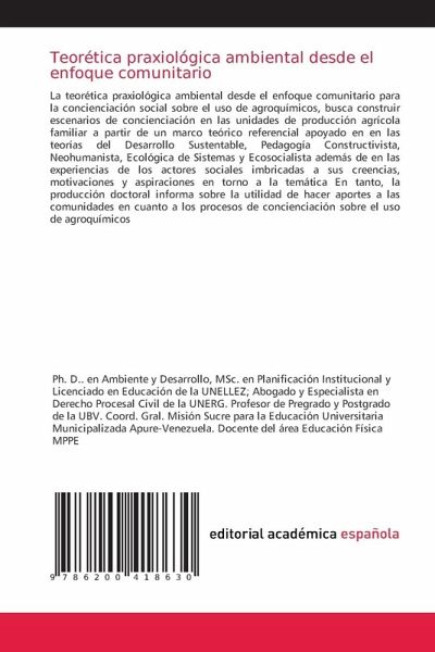La teorética praxiológica ambiental desde el enfoque comunitario para la concienciación social sobre el uso de agroquímicos, busca construir escenarios de concienciación en las unidades de producción agrícola familiar a partir de un marco teórico referencial apoyado en en las teorías del Desarrollo Sustentable, Pedagogía Constructivista, Neohumanista, Ecológica de Sistemas y Ecosocialista además de en las experiencias de los actores sociales imbricadas a sus creencias, motivaciones y aspiraciones en torno a la temática En tanto, la producción doctoral informa sobre la utilidad de hacer aportes a las comunidades en cuanto a los procesos de concienciación sobre el uso de agroquímicos