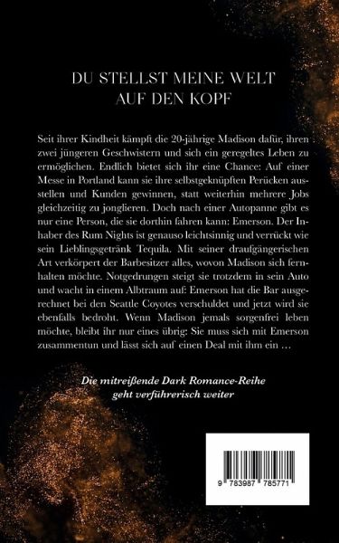 Du stellst meine Welt auf den Kopf ... Die mitreißende Dark Romance-Reihe geht verführerisch weiter Seit ihrer Kindheit kämpft die 20-jährige Madison dafür, ihren zwei jüngeren Geschwistern und sich ein geregeltes Leben zu ermöglichen. Endlich bietet sich ihr eine Chance: Auf einer Messe in Portland kann sie ihre selbstgeknüpften Perücken ausstellen und Kunden gewinnen, statt weiterhin mehrere Jobs gleichzeitig zu jonglieren. Doch nach einer Autopanne gibt es nur eine Person, die sie dorthin fahren kann: Emerson. Der Inhaber des Rum Nights ist genauso leichtsinnig und verrückt wie sein Lieblingsgetränk Tequila. Mit seiner draufgängerischen Art verkörpert der Barbesitzer alles, wovon Madison sich fernhalten möchte. Notgedrungen steigt sie trotzdem in sein Auto und wacht in einem Albtraum auf: Emerson hat die Bar ausgerechnet bei den Seattle Coyotes verschuldet und jetzt wird sie ebenfalls bedroht. Wenn Madison jemals sorgenfrei leben möchte, bleibt ihr nur eines übrig: Sie muss sich mit Emerson zusammentun und lässt sich auf einen Deal mit ihm ein … Die Bände dieser Reihe können unabhängig voneinander gelesen werden. Weitere Titel dieser Reihe Rum Nights (ISBN: 9783987780585) Erste Leser:innenstimmen „Die Herausforderungen, denen sich die Protas stellen müssen, halten die Spannung bis zum Schluss aufrecht. Ein echter Pageturner!" „Definitiv ein Liebesroman-Highlight in meinem Bücherregal!" „Die Romantic Suspense hat mich von der ersten Seite an gepackt! Die Geschichte von Madison und Emerson ist so mitreißend und die Stimmung zwischen ihnen ganz schön prickelnd und leidenschaftlich …" „Perfekte Verbindung von Drama, Romantik und Spannung. Ich liebe es!"