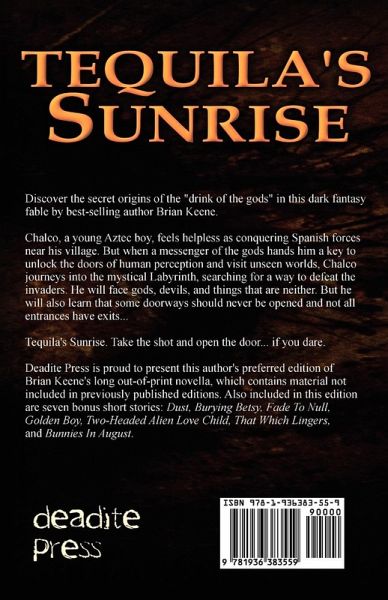 Discover the secret origins of the "drink of the gods" in this dark fantasy fable by best-selling author Brian Keene. Chalco, a young Aztec boy, feels helpless as conquering Spanish forces near his village. But when a messenger of the gods hands him a key to unlock the doors of human perception and visit unseen worlds, Chalco journeys into the mystical Labyrinth, searching for a way to defeat the invaders. He will face gods, devils, and things that are neither. But he will also learn that some doorways should never be opened and not all entrances have exits... Tequila's Sunrise. Take the shot and open the door... if you dare. Deadite Press is proud to present this author's preferred edition of Brian Keene's long out-of-print novella, which contains material not included in previously published editions. Also included in this edition are seven bonus short stories: Dust, Burying Betsy, Fade To Null, Golden Boy, Two-Headed Alien Love Child, That Which Lingers, and Bunnies In August.
