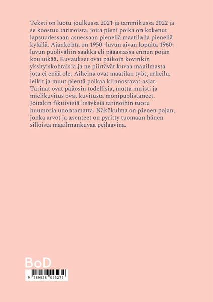 Terävät housut ja isoja koneita ¿ Tarinoita lapsuudesta Kirja koostuu tosipohjaisista tarinoista, jotka ajoittuvat pääasiassa 1960-luvun alkupuoliskolle. Vaikka elämisen ainespuut vaikuttavat nykynormistoon verrattuna hyvin vaatimattomilta eivät ihmiset kokeneet elämäänsä kovinkaan ankeana. Kaakkois-Suomessa aikuisväestölle sota-aika oli vielä tuoreessa muistissa ja tämä välittyi myös lapsille. Pienellä kylällä olivat sekä koulu että kauppa, jotka tuottavat perustan elinvoimaisuuden edelleen kehittymiselle. Oli niukkaa, mutta ei puutetta. Pikkuinen poika touhuilee pienellä maatilalla pääasiassa vaarinsa kanssa erilaisissa maatalon hevostöissä, joita kirjassa useammankin eri työvaiheen muodossa kuvataan. Eletään kuitenkin jo teknologiamurrosta, jolloin traktorit ovat syrjäyttämässä hevosvetokalustoa. Pojan intohimona ovat koneet ja mitä isompia ne ovat, sitä suuremmaksi hänen ihailunsa niitä kohden kohoaa. Traktorikuskiksi yleneminen jo hyvin varhain, ennen kouluikää, oli tälle pienelle konemiehelle mieluisaa. Urheilusta tulee pojalle toinen kiinnostuksen kohde. Talvisin hiihto ja taitojen karttuessa mäkihyppy ovat ehdottomia suosikkeja. Kesäisin yleisurheilu ja erityisesti juoksulajit innostavat poikaa, mutta suuren suosion saavuttaa myöskin seiväshyppy. Suomalaiset maailman huiput ovat pojalle suuria idoleita ja lisää esikuvia löytyy myös aivan hänen lähipiiristään. Pienellä kylällä urheilupaikat täytyy kuitenkin tehdä itse joko yksin tai samanikäisten kavereiden kanssa. Hiihtoladut ja hyppyrimäet ovat ihan joka talvisia puuhia, mutta onnistuisiko urheilukentän rakentaminen vielä alle kouluikäiseltä pojalta? Lisäksi lapset puuhailivat erilaisia pelejä ja leikkejä, jotka usein saattoivat olla itse keksittyjä tai sovellettuja. Kylän erikoisuus olikin sitten jo koulussa pelattu Montturutku, joka on niin erityinen, että se kirjoitetaan isolla alkukirjaimella erisnimen tapaan. Tästä on lajin harrastajien kesken sovittu. Montturutkua onkin nyt yli 50 vuoden tauon jälkeen lähdetty elvyttämään ja selvittämään sen taustaa. Peliä esitellään eri puolilla Suomea, myös Muuramessa. Tavoitteena olisi järjestää ensi kesänä lajin MM-kisat. Lopuksi varoitus: Kertojan kummallisista aivoituksista johtuen teksti muuttaa kieliasua käsiteltävän asian mukaan ja samoin vaihtelee kerrontatapa. Tarinat sisältävät epäpuhtauksina pieniä annoksia huumoria, joskus vähän hulvatontakin. Tämä saattaa aiheuttaa ärsytysoireita tosikoille. Yleensä oireet menevät ohi, kun seuraa uutisia. Mutta jos ärsytys jatkuu, on syytä hakeutua ammattiavun piiriin.