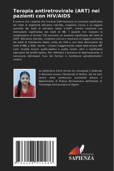 È emerso che i pazienti che ricevono ZLN mostrano un aumento significativo dei livelli di trigliceridi, bilirubina indiretta, creatinina sierica e un leggero aumento dei livelli di bilirubina totale e SGPT, mentre mostrano una diminuzione significativa dei livelli di HB. I pazienti che ricevono la combinazione di farmaci TLE mostrano un aumento significativo dei livelli di SGPT, Bilirubina indiretta, creatinina sierica e mostrano un leggero aumento dei livelli di Colesterolo totale, conta dei CD4 e una lieve diminuzione dei livelli di RBC e VLDL. Quindi, i sistemi maggiormente colpiti dalla terapia ART sono risultati essere quello epatico e quello renale, oltre a significative alterazioni del profilo lipidico. Per rallentare il processo di deterioramento, è necessario ottimizzare l'uso dei farmaci e monitorare periodicamente i sistemi.