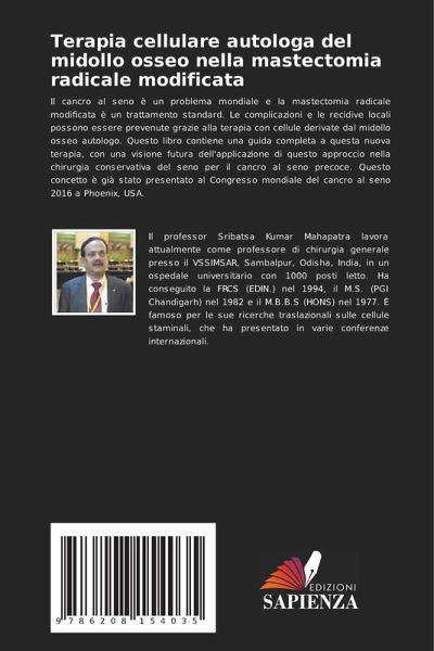 Il cancro al seno è un problema mondiale e la mastectomia radicale modificata è un trattamento standard. Le complicazioni e le recidive locali possono essere prevenute grazie alla terapia con cellule derivate dal midollo osseo autologo. Questo libro contiene una guida completa a questa nuova terapia, con una visione futura dell'applicazione di questo approccio nella chirurgia conservativa del seno per il cancro al seno precoce. Questo concetto è già stato presentato al Congresso mondiale del cancro al seno 2016 a Phoenix, USA.