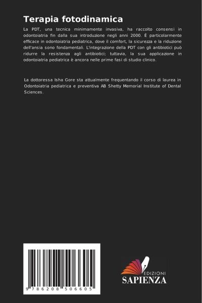 La PDT, una tecnica minimamente invasiva, ha raccolto consensi in odontoiatria fin dalla sua introduzione negli anni 2000. È particolarmente efficace in odontoiatria pediatrica, dove il comfort, la sicurezza e la riduzione dell'ansia sono fondamentali. L'integrazione della PDT con gli antibiotici può ridurre la resistenza agli antibiotici; tuttavia, la sua applicazione in odontoiatria pediatrica è ancora nelle prime fasi di studio clinico.