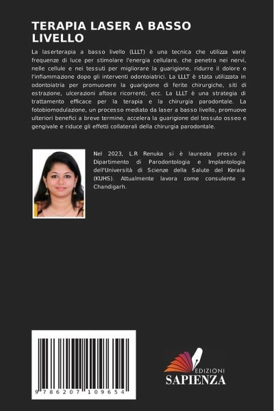 La laserterapia a basso livello (LLLT) è una tecnica che utilizza varie frequenze di luce per stimolare l'energia cellulare, che penetra nei nervi, nelle cellule e nei tessuti per migliorare la guarigione, ridurre il dolore e l'infiammazione dopo gli interventi odontoiatrici. La LLLT è stata utilizzata in odontoiatria per promuovere la guarigione di ferite chirurgiche, siti di estrazione, ulcerazioni aftose ricorrenti, ecc. La LLLT è una strategia di trattamento efficace per la terapia e la chirurgia parodontale. La fotobiomodulazione, un processo mediato da laser a basso livello, promuove ulteriori benefici a breve termine, accelera la guarigione del tessuto osseo e gengivale e riduce gli effetti collaterali della chirurgia parodontale.