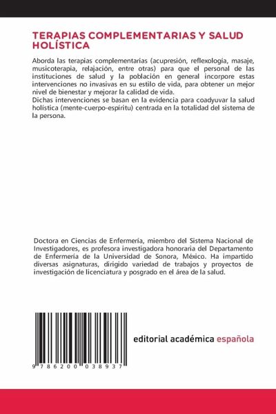 Aborda las terapias complementarias (acupresión, reflexología, masaje, musicoterapia, relajación, entre otras) para que el personal de las instituciones de salud y la población en general incorpore estas intervenciones no invasivas en su estilo de vida, para obtener un mejor nivel de bienestar y mejorar la calidad de vida.Dichas intervenciones se basan en la evidencia para coadyuvar la salud holística (mente-cuerpo-espíritu) centrada en la totalidad del sistema de la persona.