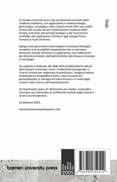 Le terapie ormonali sono una componente centrale della medicina moderna, con applicazioni in endocrinologia, ginecologia, oncologia e oltre. Questo testo offre una solida visione del mondo ancora relativamente moderno delle terapie ormonali, dai principi biologici e dai meccanismi scientifici alle applicazioni cliniche e agli sviluppi futuri, nonché ai rischi intrinseci. Spiega come gli ormoni intervengono in processi fisiologici complessi e le possibilità terapeutiche che ne derivano. Numerosi esempi illustrano le applicazioni nel trattamento dei disturbi ormonali, dall'ipotiroidismo alla terapia ormonale in oncologia. Un capitolo è dedicato alle sfide delle problematiche attuali della terapia ormonale, come i trattamenti transgender o l'uso di ormoni per migliorare le prestazioni. Vengono inoltre evidenziate le prospettive future, come la medicina personalizzata, lo sviluppo di nuovi farmaci e il ruolo degli ormoni nella ricerca sull'invecchiamento. Un'importante opera di riferimento per medici, scienziati e chiunque sia interessato al multiforme mondo degli ormoni e al loro uso terapeutico. 1a edizione 2025
