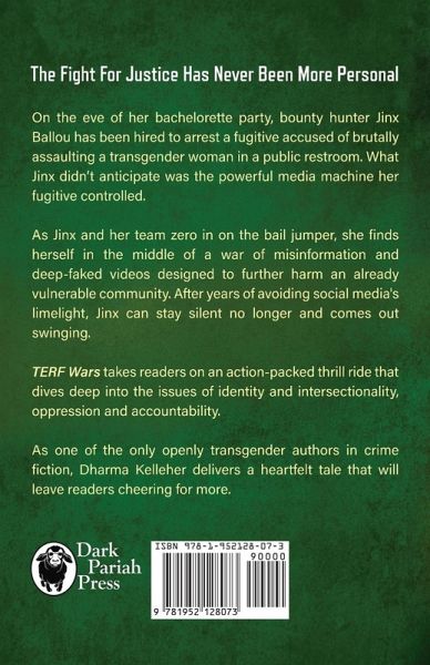The Fight For Justice Has Never Been More Personal On the eve of her bachelorette party, bounty hunter Jinx Ballou has been hired to apprehend a fugitive accused of brutally murdering a transgender woman in a public restroom. What Jinx didn't anticipate was the powerful media machine her fugitive controlled. As Jinx and her team zero in on the bail jumper, she finds herself in the middle of a war of misinformation and deep-faked videos designed to further harm an already vulnerable community. After years of avoiding social media's limelight, Jinx can stay silent no longer and comes out swinging. TERF Wars takes readers on an action-packed thrill ride that dives deep into the issues of identity and intersectionality, oppression and accountability. As one of the only openly transgender authors in crime fiction, Dharma Kelleher delivers a heartfelt tale that will leave readers cheering for more.
