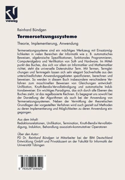 Das vorliegende Buch ist aus mehreren Vorlesungen hervorgegangen, die ich an der Fakultät für Informatik der Universität Tübingen gehalten habe. Diese Vorlesungen richteten sich an Studenten, die Informatik im Haupt- oder Nebenfach studierten. Neben Informatikern könnte dieses Buch aber auch für alle, die sich mit formalen Systemen beschäftigen, wertvoll sein, insbesondere Mathematiker, Logiker und Sprachwissenschaftler. Das Buch ist eine Einführung in das Gebiet der Termersetzungssysteme. Dennoch setzt es ei nige fundamentale Grundlagen der Informatik voraus. Diese Grundkenntnisse umfassen die Grundlagen des Programmierens, ein intuitives Verständnis der Prädikatenlogik und gewisse theoretische Grundlagen (Berechenbarkeit und formale Sprachen), so wie es im allgemeinen bis zum Informatikvordiplom (sowohl im Haupt- als auch im Nebenfach) vermittelt wird. Auch wenn dieses Buch zunächst als Einführung in die Termersetzungssysteme gedacht ist, so soll es die Leser letztlich in die Lage versetzen, selbständig aktuelle Forschungspublika tionen zu studieren. Systeme! zu spezifizieren ist eine wichtige Aufgabe in allen Bereichen der Informatik. Die Spezifikation gehört zur Entwurfsphase jedes Projektes und dient als (Vertrags-)Grundlage für seine Realisierung (Implementierung), ebenso zur Dokumentation, und sie ist äußerst wichtig bei der Wartung eines fertigen Systems. Formale, d. h. mathematisch exakte Spezifi kationen haben den unbestreitbaren Vorteil, daß sie keinerlei Interpretationsspielraum lassen und somit unzweideutig festlegen, was ein System wirklich leisten soll. Leider sind forma 2 le Spezifikationen für Ungeübte sowohl schwierig zu erstellen als auch zu lesen. Deshalb fehlt oft die Motivation, eine formale Spezifikation zu erstellen.