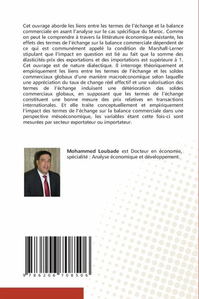 Cet ouvrage aborde les liens entre les termes de l'échange et la balance commerciale en axant l'analyse sur le cas spécifique du Maroc. Comme on peut le comprendre à travers la littérature économique existante, les effets des termes de l'échange sur la balance commerciale dépendent de ce qui est communément appelé la condition de Marshall-Lerner stipulant que l'impact en question est lié au fait que la somme des élasticités-prix des exportations et des importations est supérieure à 1. Cet ouvrage est de nature dialectique. Il interroge théoriquement et empiriquement les liens entre les termes de l'échange et les soldes commerciaux globaux d'une manière macroéconomique selon laquelle une appréciation du taux de change réel effectif et une valorisation des termes de l'échange induisent une détérioration des soldes commerciaux globaux, en supposant que les termes de l'échange constituent une bonne mesure des prix relatives en transactions internationales. Et elle traite conceptuellement et empiriquement l'impact des termes de l'échange sur la balance commerciale dans une perspective mésoéconomique, les variables étant cette fois-ci sont mesurées par secteur exportateur ou importateur.