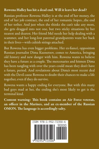 Rowena Halley has hit a dead end. Will it leave her dead? Russian professor Rowena Halley is at the end of her money, the end of her job contract, the end of her romantic hopes...the end of her tether. And just when she thinks she can't take any more, she gets dragged into not one, but two sticky situations by her nearest and dearest. Her friend Mel needs her help dealing with a scammer, and her long-lost paternal grandparents want her back in their lives-with cultish strings attached. But Rowena has even bigger problems. Her ex-fiancé, opposition Russian journalist Dima Kuznetsov, comes to America, bringing old history and new danger with him. Rowena wants to believe they have a future as a couple. The mercenaries and hitmen Dima has been tangling with over the years could mean they don't have a future, period. And revelations about Dima's most recent deal with the Devil cause Rowena to doubt their chances to make a life together, even if they do survive. Rowena wants a happy ending for everyone. But with this many bad guys mad at her, the ending she's most likely to get is the terminal kind. Content warning: This book contains an Air Force veteran, an officer in the Marines, and an ex-member of the Russian OMON. The language is accordingly salty.