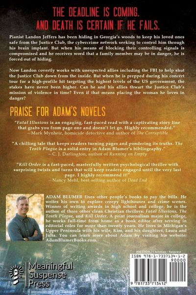In the Justice Club, You're Either All in, or You're Dead Pianist Landon Jeffers has been hiding in Georgia's woods to keep his loved ones safe from the Justice Club, the cybercrime network seeking to control him through his brain implant. But when his means of blocking their controlling signals is compromised and he receives word that a family member may be in danger, he is forced out of hiding. Now Landon covertly works with unexpected allies including the FBI to help shut the Justice Club down from the inside. But when he is prepped during his concert tour for a high-profile hit targeting the highest levels of the US government, the stakes have never been higher. Can he and his allies thwart the Justice Club's mission of violence in time? Even if that means placing the woman he loves in danger? The deadline is coming. And death is certain if he fails. Note: This is a clean Christian thriller. It does not contain profanity, vulgarity, or sexual content. It does contain a suspense story with overt faith elements and mild violence. Don't miss the first book in the series, Kill Order, book 1 in the Landon Jeffers Thriller Series, available from Meaningful Suspense Press.