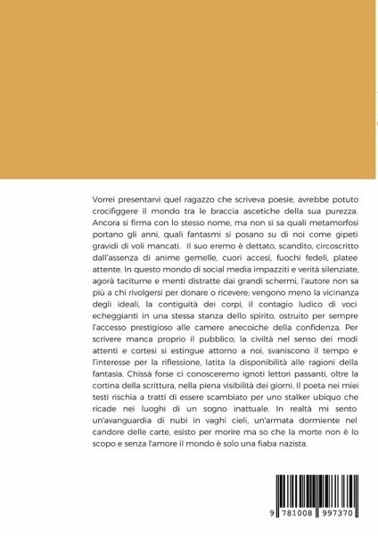 Questa raccolta di poesie, pubblicata nel marzo del 2021, si intitola "Termine di paragone". L'autore, a cui spetta in toto il copyright dell'intera opera, è lo scrittore e giornalista italiano Emanuele Palli, alla sua quinta pubblicazione poetica. Il codice ISBN del libro è 9781008997370. La laurea in Lingue e Civiltà Orientali all'Università Ca' Foscari di Venezia conseguita dall'autore riflette anche nelle propensioni accademiche la sua spiccata sensibilità verso remote distanze di cui sa interpretare i silenzi e tradurre la diversità di dimensioni irraggiungibili, stilando una metafisica di incontri impossibili. Proprio un amore naufragato con un ragazza giapponese dopo anni di passione e patimenti, speranze e cadute è il tema dominante di questo affondo poetico nelle regioni più profonde della psiche da cui nessun essere umano può tornare indenne. Si esce dall'imboccatura dell'Ade come Orfeo con un'ombra evanescente che ci accompagna in ogni passo, simile alla musica insistente della perdita. Eppure la follia è fertile, ci riporta ai fondamenti di un'identità in fieri, è fuoco che rinnova e consacra trasformando le ferite in gloriose cicatrici, una luce che ci guida verso l'uscita, firma un nuovo inizio col suo inchiostro che scorre come sangue. Non più silenziato il boato del cuore rimbomba dal sepolcro, spalanca le sue ali l'anima ritornata nella sua sede, nel nido della mente pigola una neonata armonia. Dalle sponde di un antico amore si torna nel presente carichi di sapienza, non più madidi di lacrime gli occhi tornano a vedere i contorni del reale, la coscienza del limite diviene unità di misura, gli urti del trauma un ritmo d'apprendimento, una storia che deborda in metafora, caduta che si fa meteora, parabola, emblema ed embolia. Il poeta si libera ridendo della poesia, vince abolendosi, si fa stentorea abdicazione predicando l'impossibile. Eppure c'è un nocciolo di realtà agganciato alle parole: quel rapporto sfuggente tra il racconto e l'esistenza è la misura, la spettrale proporzione che rende possibile il linguaggio e con esso la poesia, uno sbilanciamento oltre l'apparire, verso l'illusione dell'essere e del durare, così come gli amori vivono del miraggio che la nascita possa sconfiggere ancora una volta l'opera oscena della morte.
