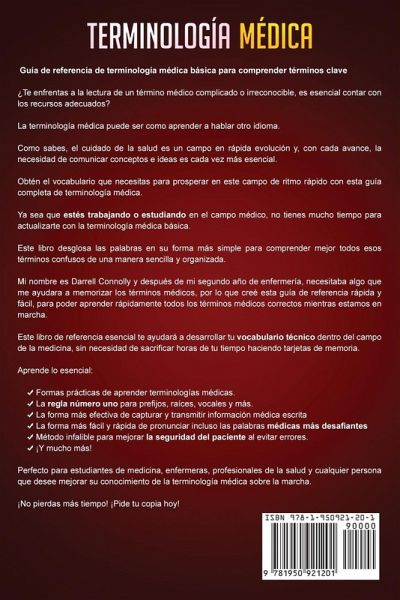 Guía de referencia de terminología médica básica para comprender términos clave ¿Te enfrentas a la lectura de un término médico complicado o irreconocible, es esencial contar con los recursos adecuados? La terminología médica puede ser como aprender a hablar otro idioma. Como sabes, el cuidado de la salud es un campo en rápida evolución y, con cada avance, la necesidad de comunicar conceptos e ideas es cada vez más esencial. Obtén el vocabulario que necesitas para prosperar en este campo de ritmo rápido con esta guía completa de terminología médica. Ya sea que estés trabajando o estudiando en el campo médico, no tienes mucho tiempo para actualizarte con la terminología médica básica. Este libro desglosa las palabras en su forma más simple para comprender mejor todos esos términos confusos de una manera sencilla y organizada. Mi nombre es Darrell Connolly y después de mi segundo año de enfermería, necesitaba algo que me ayudara a memorizar los términos médicos, por lo que creé esta guía de referencia rápida y fácil, para poder aprender rápidamente todos los términos médicos correctos mientras estamos en marcha. Este libro de referencia esencial te ayudará a desarrollar tu vocabulario técnico dentro del campo de la medicina, sin necesidad de sacrificar horas de tu tiempo haciendo tarjetas de memoria. Aprende lo esencial: Formas prácticas de aprender terminologías médicas. La regla número uno para prefijos, raíces, vocales y más. La forma más efectiva de capturar y transmitir información médica escrita La forma más fácil y rápida de pronunciar incluso las palabras médicas más desafiantes Método infalible para mejorar la seguridad del paciente al evitar errores. ¡Y mucho más! Perfecto para estudiantes de medicina, enfermeras, profesionales de la salud y cualquier persona que desee mejorar su conocimiento de la terminología médica sobre la marcha. ¡No pierdas más tiempo! ¡Pide tu copia hoy!