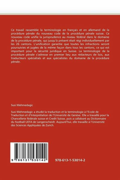 Ce travail rassemble la terminologie en français et en allemand de la procédure pénale du nouveau code de la procédure pénale suisse. Ce nouveau code unifie la jurisprudence au niveau fédéral dans le domaine de la procédure pénale, qui jusqu'à présent était régi individuellement par les 26 cantons. L'unification garantie que toutes les infractions seront poursuivies et jugées de la même façon dans tous les cantons, ce qui est important pour la sécurité juridique en Suisse. La terminologie de la procédure pénale s'adresse en premier lieu aux rédacteurs de lois, aux traducteurs spécialisés et aux spécialistes du domaine de la procédure pénale.…mehr