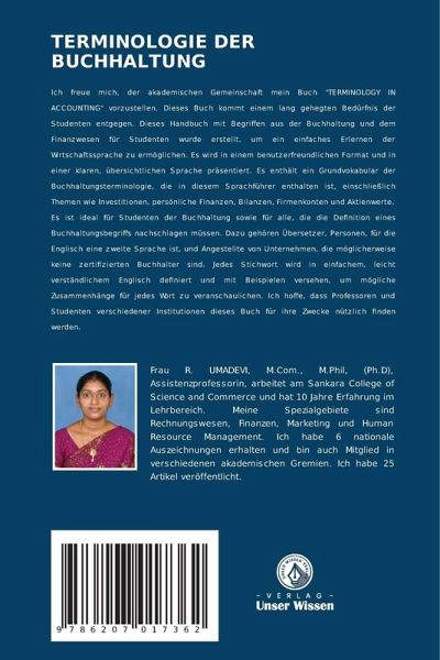 Ich freue mich, der akademischen Gemeinschaft mein Buch "TERMINOLOGY IN ACCOUNTING" vorzustellen. Dieses Buch kommt einem lang gehegten Bedürfnis der Studenten entgegen. Dieses Handbuch mit Begriffen aus der Buchhaltung und dem Finanzwesen für Studenten wurde erstellt, um ein einfaches Erlernen der Wirtschaftssprache zu ermöglichen. Es wird in einem benutzerfreundlichen Format und in einer klaren, übersichtlichen Sprache präsentiert. Es enthält ein Grundvokabular der Buchhaltungsterminologie, die in diesem Sprachführer enthalten ist, einschließlich Themen wie Investitionen, persönliche Finanzen, Bilanzen, Firmenkonten und Aktienwerte. Es ist ideal für Studenten der Buchhaltung sowie für alle, die die Definition eines Buchhaltungsbegriffs nachschlagen müssen. Dazu gehören Übersetzer, Personen, für die Englisch eine zweite Sprache ist, und Angestellte von Unternehmen, die möglicherweise keine zertifizierten Buchhalter sind. Jedes Stichwort wird in einfachem, leicht verständlichem Englisch definiert und mit Beispielen versehen, um mögliche Zusammenhänge für jedes Wort zu veranschaulichen. Ich hoffe, dass Professoren und Studenten verschiedener Institutionen dieses Buch für ihre Zwecke nützlich finden werden.