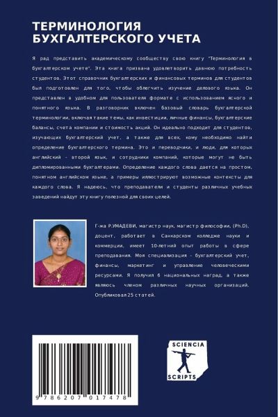 Ya rad predstawit' akademicheskomu soobschestwu swoü knigu "Terminologiq w buhgalterskom uchete". Jeta kniga prizwana udowletworit' dawnüü potrebnost' studentow. Jetot sprawochnik buhgalterskih i finansowyh terminow dlq studentow byl podgotowlen dlq togo, chtoby oblegchit' izuchenie delowogo qzyka. On predstawlen w udobnom dlq pol'zowatelq formate s ispol'zowaniem qsnogo i ponqtnogo qzyka. V razgowornik wklüchen bazowyj slowar' buhgalterskoj terminologii, wklüchaq takie temy, kak inwesticii, lichnye finansy, buhgalterskie balansy, scheta kompanii i stoimost' akcij. On ideal'no podhodit dlq studentow, izuchaüschih buhgalterskij uchet, a takzhe dlq wseh, komu neobhodimo najti opredelenie buhgalterskogo termina. Jeto i perewodchiki, i lüdi, dlq kotoryh anglijskij - wtoroj qzyk, i sotrudniki kompanij, kotorye mogut ne byt' diplomirowannymi buhgalterami. Opredelenie kazhdogo slowa daetsq na prostom, ponqtnom anglijskom qzyke, a primery illüstriruüt wozmozhnye kontexty dlq kazhdogo slowa. Ya nadeüs', chto prepodawateli i studenty razlichnyh uchebnyh zawedenij najdut ätu knigu poleznoj dlq swoih celej.