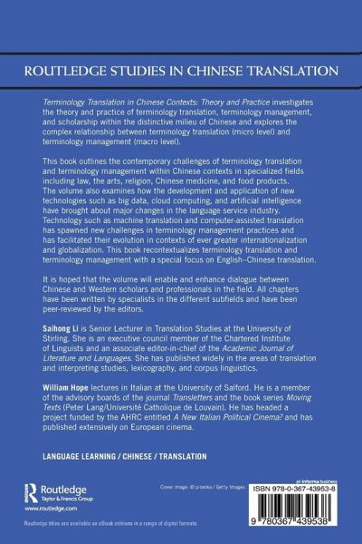 Terminology Translation in Chinese Contexts: Theory and Practice investigates the theory and practice of terminology translation, terminology management, and scholarship within the distinctive milieu of Chinese and explores the complex relationship between terminology translation (micro level) and terminology management (macro level). This book outlines the contemporary challenges of terminology translation and terminology management within Chinese contexts in specialized fields including law, the arts, religion, Chinese medicine, and food products. The volume also examines how the development and application of new technologies such as big data, cloud computing, and artificial intelligence have brought about major changes in the language service industry. Technology such as machine translation and computer-assisted translation has spawned new challenges in terminology management practices and has facilitated their evolution in contexts of ever greater internationalization and globalization. This book recontextualizes terminology translation and terminology management with a special focus on English-Chinese translation. It is hoped that the volume will enable and enhance dialogue between Chinese and Western scholars and professionals in the field. All chapters have been written by specialists in the different subfields and have been peer-reviewed by the editors.