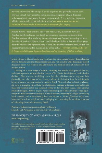 In this history of black thought and racial activism in twentieth-century Brazil, Paulina Alberto demonstrates that black intellectuals, and not just elite white Brazilians, shaped discourses about race relations and the cultural and political terms of inclusion in their modern nation. Drawing on a wide range of sources, including the prolific black press of the era, and focusing on the influential urban centers of Sao Paulo, Rio de Janeiro, and Salvador da Bahia, Alberto traces the shifting terms that black thinkers used to negotiate their citizenship over the course of the century, offering fresh insight into the relationship between ideas of race and nation in modern Brazil. Alberto finds that black intellectuals' ways of engaging with official racial discourses changed as broader historical trends made the possibilities for true inclusion appear to flow and then recede. These distinct political strategies, Alberto argues, were nonetheless part of black thinkers' ongoing attempts to make dominant ideologies of racial harmony meaningful in light of evolving local, national, and international politics and discourse. Terms of Inclusion tells a new history of the role of people of color in shaping and contesting the racialized contours of citizenship in twentieth-century Brazil.