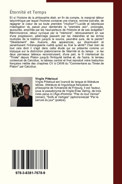 Et si l'histoire de la philosophie était, en fin de compte, le marginal détour labyrinthique par lequel l'homme conserve une chance, minime soit-elle, de regagner le coeur de sa toute première "intuition"? Lucide et laborieuse investigation du passé pour réentendre la "première voix", prolongée, assourdie, amplifiée par les haut-parleurs de l'histoire et de ses exégètes? Réminiscence, retour cyclique par la "mémoire", rebroussement en vue d'une progression, pèlerinage passant par les méandres et les échos multiples de la tradition jusqu'à la source, peut-être pure, de la parole? "Dévoilement" des illusions, des apparences, qui dissimulent et pervertissent l'intransigeante nudité qu'est au final la vérité? C'est bien de tout cela dont il s'agit dans cette étude qui se présente comme un triptyque sur la distinction platonicienne de l'éternité et du temps : si les deux panneaux latéraux reconstruisent, d'une part, le fil intertextuel du "Timée" depuis Platon jusqu'à l'Antiquité tardive et, de l'autre, le terreau contextuel de Calcidius, le tableau central et final reproduit notre traduction française inédite des chapitres CV à CXVIII du "Commentaire au Timée de Platon" par Calcidius.