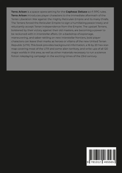 Terra Arisen is a space-opera setting for the Cepheus Deluxe sci-fi RPG rules. Terra Arisen introduces player characters to the immediate aftermath of the Terran Liberation War against the mighty Reticulan Empire and its many thralls. The Terrans forced the Reticulan Empire to sign a humiliating peace treaty and reluctantly accept Terran independence from the Empire. The upstart Terrans, bolstered by their victory against their old masters, are becoming a power to be reckoned with in interstellar affairs. On a backdrop of espionage, maneuvering, and saber-rattling on new interstellar frontiers, bold player characters can leave their marks as heroes or villains of the new United Terran Republic (UTR). This book provides background information, a 16 by 20 hex star-map covering most of the UTR and some alien territory, and write-ups of all 120 major worlds in this area, as well as other materials necessary to run a science fiction roleplaying campaign in the exciting times of the 23rd century. This book contains: History and background material for 23rd century Terra and the larger universe. Corporations, political parties, and illegal groups - both Terran and alien. 4 major alien species and several minor ones - all detailed! Rules for generating and playing characters from 5 alien species. 7 alien Careers and 5 Terran ones - from psionic Reticulan Nobles to the heroic Terran Guard! Character generation rules and event tables for all included careers. 2 small craft and 5 starships with full game statistics and high-res deck plans. The Terran Quadrant, including 120 detailed worlds and a high-res star map. A detailed adventure chapter with a wide variety of hooks for exciting adventures in Terran and alien space! Note that this book provides character generations, biological and cultural background, and flying saucers (!) for playing Gray Aliens - ready to drop into any Cepheus Deluxe campaign and quite compatible with other 2d6 sci-fi RPGs as well! This setting requires the Cepheus Deluxe rules for use.