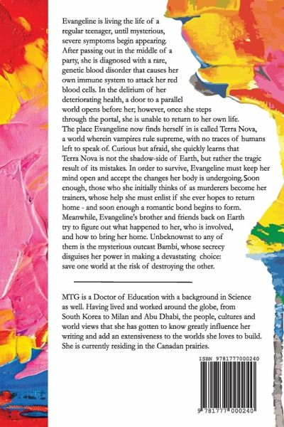 Evangeline is living the life of a regular teenager, until mysterious, severe symptoms begin appearing. After passing out in the middle of a party, she is diagnosed with a rare, genetic blood disorder that causes her own immune system to attack her red blood cells. In the delirium of her deteriorating health, a door to a parallel world opens before her; however, once she steps through the portal, she is unable to return to her own life. The place Evangeline now finds herself in is called Terra Nova, a world wherein vampires rule supreme, with no traces of humans left to speak of. Curious but afraid, she quickly learns that Terra Nova is not the shadow-side of Earth, but rather the tragic result of its mistakes. In order to survive, Evangeline must keep her mind open and accept the changes her body is undergoing. Soon enough, those who she initially thinks of as murderers become her trainers, whose help she must enlist if she ever hopes to return home - and soon enough a romantic bond begins to form. Meanwhile, Evangeline's brother and friends back on Earth try to figure out what happened to her, who is involved, and how to bring her home. Unbeknownst to any of them is the mysterious outcast Bambi, whose secrecy disguises her power in making a devastating choice: save one world at the risk of destroying the other.
