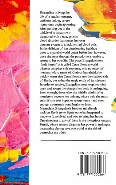Evangeline is living the life of a regular teenager, until mysterious, severe symptoms begin appearing. After passing out in the middle of a party, she is diagnosed with a rare, genetic blood disorder that causes her own immune system to attack her red blood cells. In the delirium of her deteriorating health, a door to a parallel world opens before her; however, once she steps through the portal, she is unable to return to her own life. The place Evangeline now finds herself in is called Terra Nova, a world wherein vampires rule supreme, with no traces of humans left to speak of. Curious but afraid, she quickly learns that Terra Nova is not the shadow-side of Earth, but rather the tragic result of its mistakes. In order to survive, Evangeline must keep her mind open and accept the changes her body is undergoing. Soon enough, those who she initially thinks of as murderers become her trainers, whose help she must enlist if she ever hopes to return home - and soon enough a romantic bond begins to form. Meanwhile, Evangeline's brother and friends back on Earth try to figure out what happened to her, who is involved, and how to bring her home. Unbeknownst to any of them is the mysterious outcast Bambi, whose secrecy disguises her power in making a devastating choice: save one world at the risk of destroying the other.
