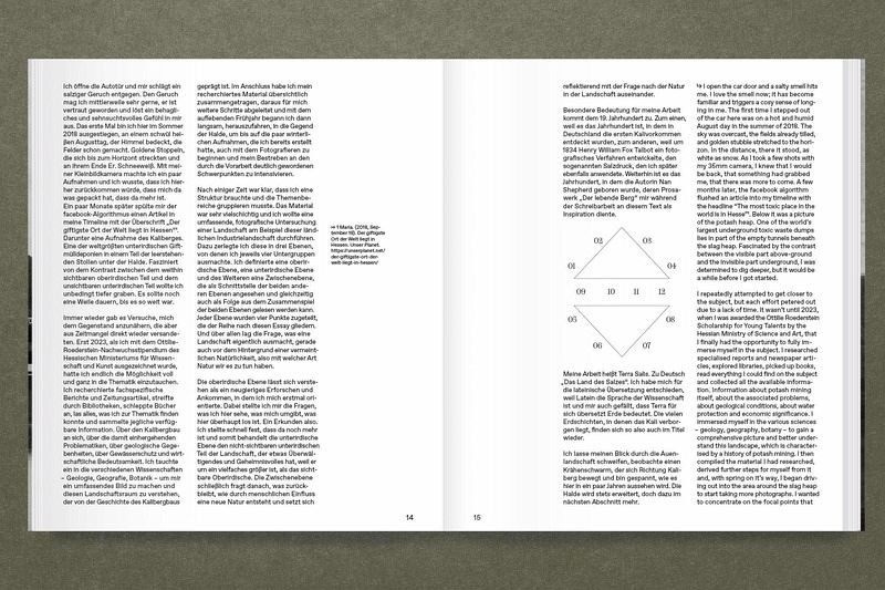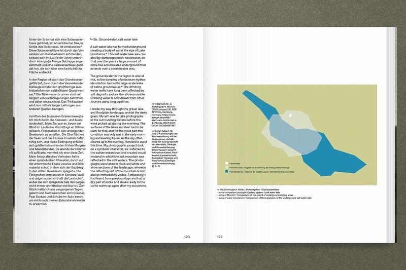 "Terra Salis" ist eine fotografische Auseinandersetzung mit dem komplexen Themenfeld des Kali-Bergbaus im osthessischen Heringen an der Werra. Der Fokus liegt nicht nur auf der äußeren Dimension des größten Salzberges in Deutschland, sondern auch auf den transformatorischen Prozessen der umliegenden Landschaft und den Auswirkungen der industriellen Nutzung auf natürliche Lebensräume. Dabei werden zentrale Fragen zur Konstruktion von Landschaft und Natur sowie zur Legitimität menschlicher Eingriffe in diese Räume aufgeworfen. Das abgebaute Kali findet vorwiegend als Düngemittel in der Landwirtschaft Verwendung, während das verbleibende Salz das visuelle und kulturelle Erscheinungsbild einer ganzen Region prägt. Teile des unterirdischen Stollensystems dienen als Deponie für giftige Abfälle aus aller Welt, wodurch Heringen an der Werra als einer der giftigsten Orte weltweit gilt. Zudem hat die Einleitung von Kaliabwässern zur Entstehung eines künstlichen Binnensalz-Standorts geführt, der eine charakteristische Flora von Salzpflanzen hervorgebracht hat. Die Werra, einst ein ökologisch vielfältiger Fluss, ist heute infolge dieser Aktivitäten der salzigste Fluss Europas. Gleichzeitig spielt die Kali-Industrie eine zentrale Rolle als bedeutender Wirtschaftsfaktor und Hauptarbeitgeber der Region. Die Arbeit gliedert sich in zwölf Werkgruppen, die in drei Ebenen (eine oberirdische, eine unterirdische und eine verbindende Zwischenebene) strukturiert sind und verschiedene Aspekte des Themas beleuchten. Unterschiedliche fotografische Techniken und Materialien kommen zum Einsatz, um ein vielschichtiges Verständnis dieser komplexen Thematik zu ermöglichen.