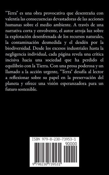 "Terra" es una obra provocativa que desentraña con valentía las consecuencias devastadoras de las acciones humanas sobre el medio ambiente. A través de una narrativa corta y envolvente, el autor arroja luz sobre la explotación desenfrenada de los recursos naturales, la contaminación desmedida y el desdén por la biodiversidad. Desde los excesos industriales hasta la negligencia individual, cada página revela una crítica incisiva hacia una sociedad que ha perdido el equilibrio con la Tierra. Con una prosa poderosa y un llamado a la acción urgente, "Terra" desafía al lector a reflexionar sobre su papel en la preservación del planeta y ofrece una visión esperanzadora para un futuro sostenible.