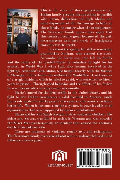 This is the story of three generations of an Italian family proving that anything is possible with honor, dedication and high ideals, and most important of all, the courage to back up those ideals, no matter what the consequences. The Terranova family proves once again that this country became great because of the grit, determination and hard work of immigrants from all over the world. It is about the ageing, but still commanding grandfather, Stefano, who started the cycle. Armando, the heroic son, who left his family and the safety of the United States to volunteer to fight for his country in World War I when Italy first became involved in the fighting. Armando's son, Mario, who fought bravely with the Marines in Shanghai, China, before the outbreak of World War II and because of a tragic incident, which he tried to avoid, was sentenced to fifteen years in prison. Through good behavior and the efforts of his father, he was released after serving twenty-six months. Mario's hatred for the drug traffic in the United States, and his fight to give Italian immigrants a solid foothold in America, made him a role model for all the people that came to this country to find a better life. When he became a business tycoon, he gave lavishly to all organizations that were supported by donor contributions. Mario and his wife Sarah brought up five wonderful children. His oldest son, Steven, was killed in action in Vietnam and was awarded the Silver Star posthumously, an incident that caused the untimely death of his beloved wife. There are moments of violence, tender love, and redemption. The Terranova family overcame all obstacles to making their sphere of influence a better place.